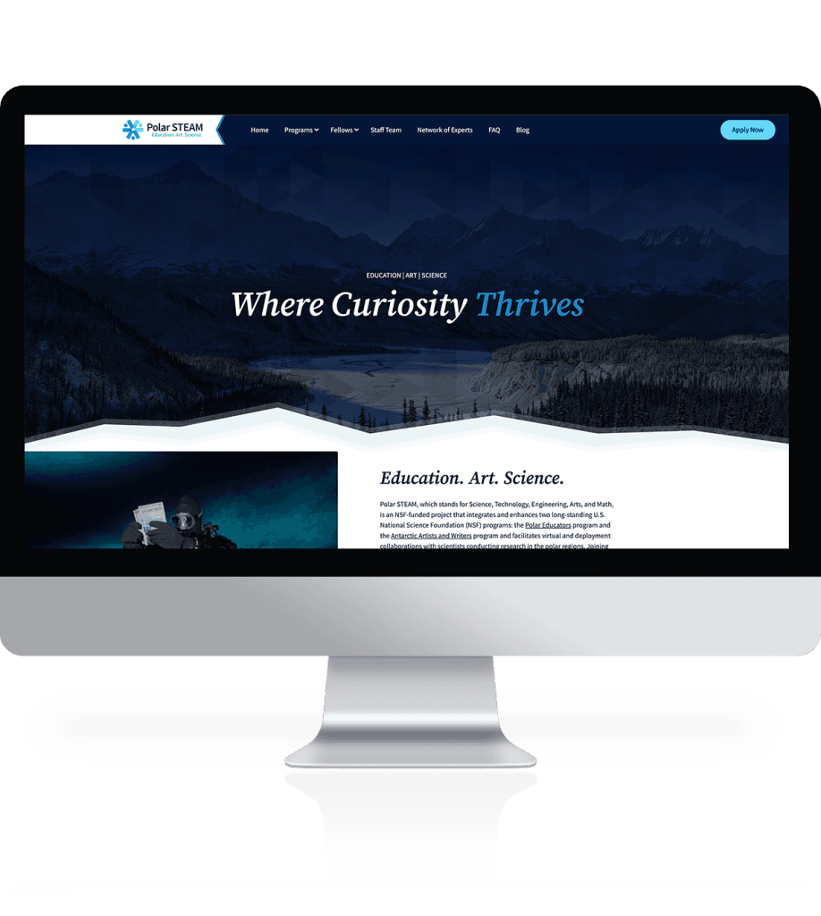 For Polar STEAM, we crafted a digital home as multifaceted as the NSF-funded initiative itself—equal parts gallery, research, and classroom. The custom design layers sweeping polar imagery with crisp typography to immerse visitors in the science and artistry of the world’s coldest region, while a playful color system nods to auroras and sea-ice gradients. Behind the scenes, a modular content framework lets researchers post resources, artists showcase their work, and educators upload ready-to-teach lesson plans—all tagged and filterable so visitors can explore content by subject or topic. The result is a vibrant, easy-to-navigate platform that unites creativity, research, and education—advancing Polar STEAM’s mission to reach new audiences and better engage the next generation of researchers and science learners.